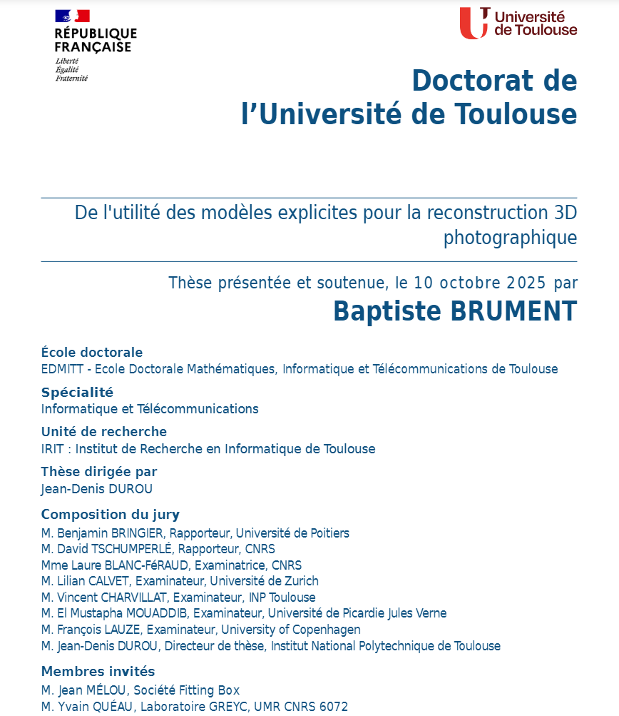 We are pleased to announce the PhD defense of a thesis dedicated to improving the robustness and accuracy of 3D reconstruction methods by integrating explicit models and leveraging physical (reflectance, shading, refraction) and geometric (gradients, silhouettes) properties.
